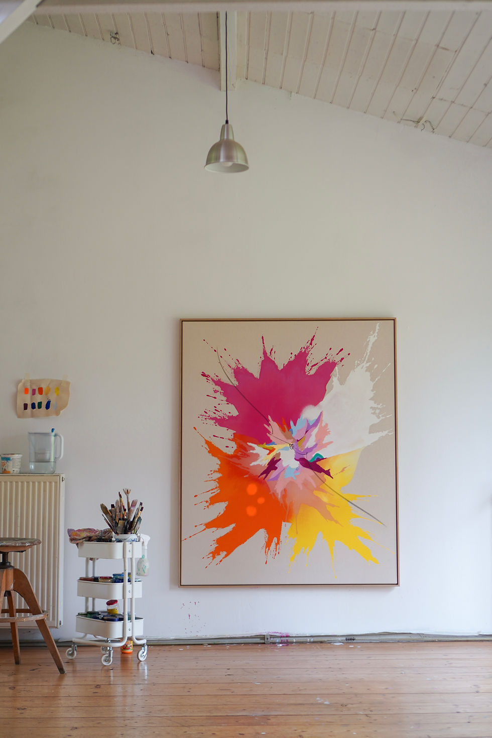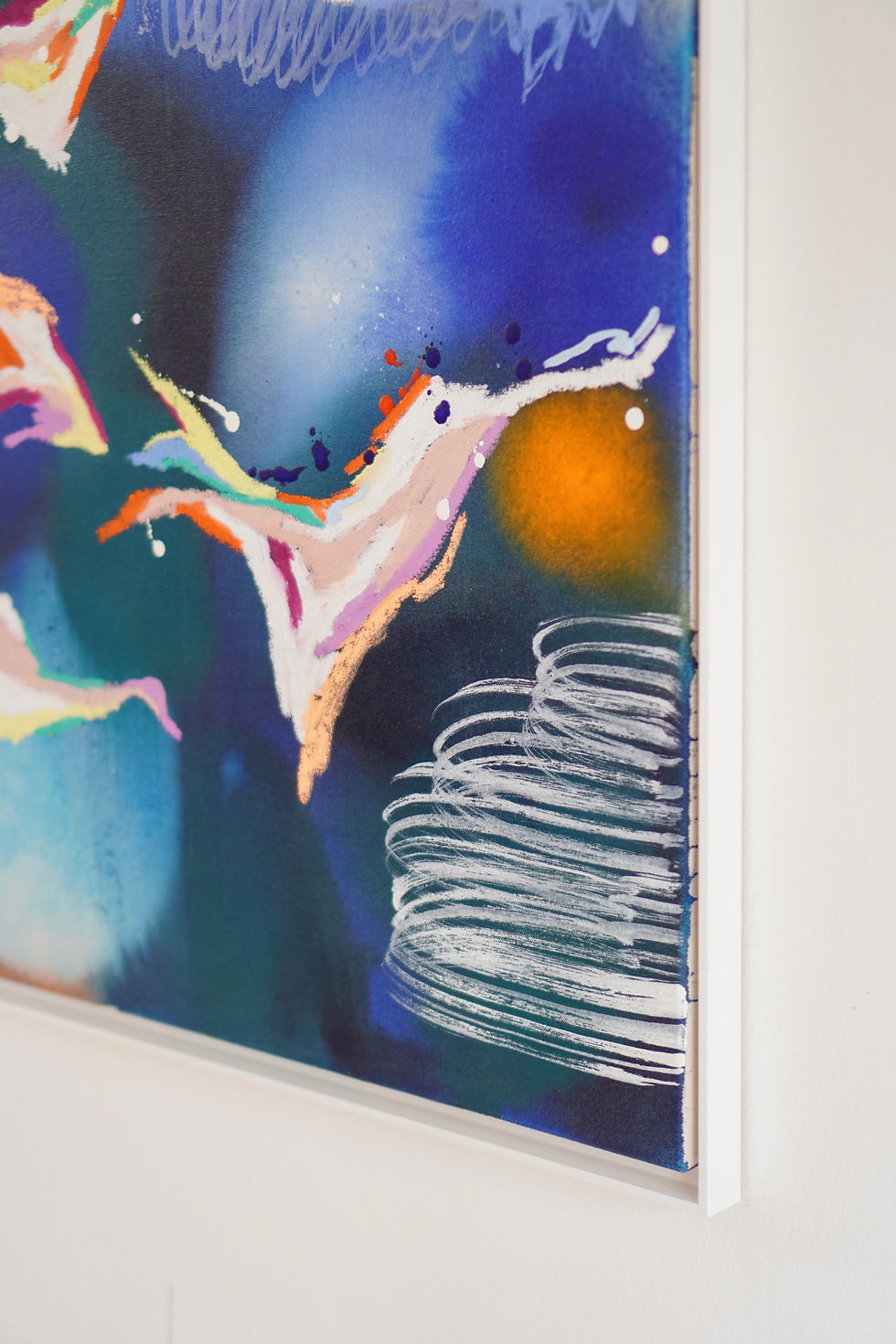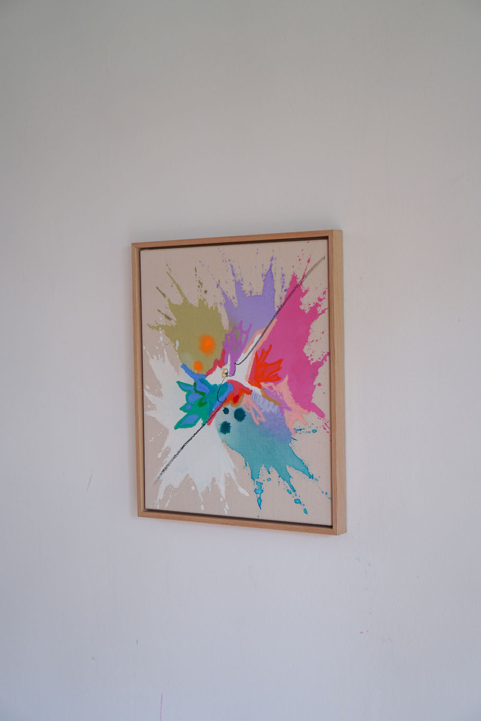 mixed media on raw cotton 30 x 40, framed in orange acrylic glass